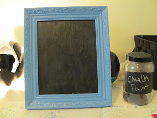 Mix grout with the color of paint you want your chalkboard to be (I used black).  Paint on the glass of the photo frame. Voila!  Chalkboard.