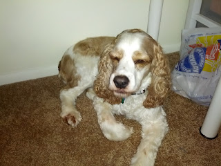 So tonight we decorated for Halloween...dinner was shells and cheese and chicken strips..yup.  I got caught up on New Girl.  When are Nick and Jess going to end up together? Sad I can't watch the Dexter premier until tomorrow after class. I have the sweetest dog randomly giving me dog kisses right now!  Cocker Spaniels are the best dogs.